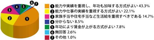 「能力や実績を重視し年功も加味する方式がよい」43.3%で最も多く、次いで「能力や仕事の実績を重視する方式がよい」22.1%でした。