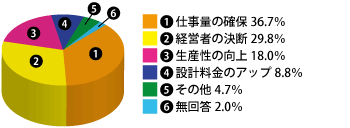 「仕事量の確保」36.7%で最も多く、次いで「経営者の決断」29.8%、「生産性の向上」18.0%でした。